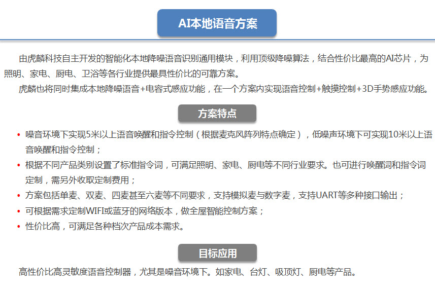 由虎麟科技自主开发的低成本MCU与高性能AI降噪两种模块方案,满足客户不同应用场景需求,例如家电、厨电、照明等各类产品。